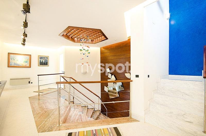 Entering the large marble floored entrance hall, we see the stately, palatial staircase with high ceilings and natural light well. We then enter a spacious, light-filled living room with a fireplace, panoramic windows, a sunken couch and direct access to the garden and then reach a fully equipped kitchen that opens onto the dining room. A double bedroom, a full bathroom, laundry room and storage rooms are also available on this floor.