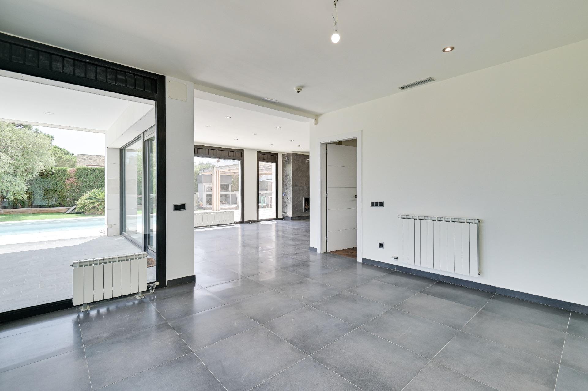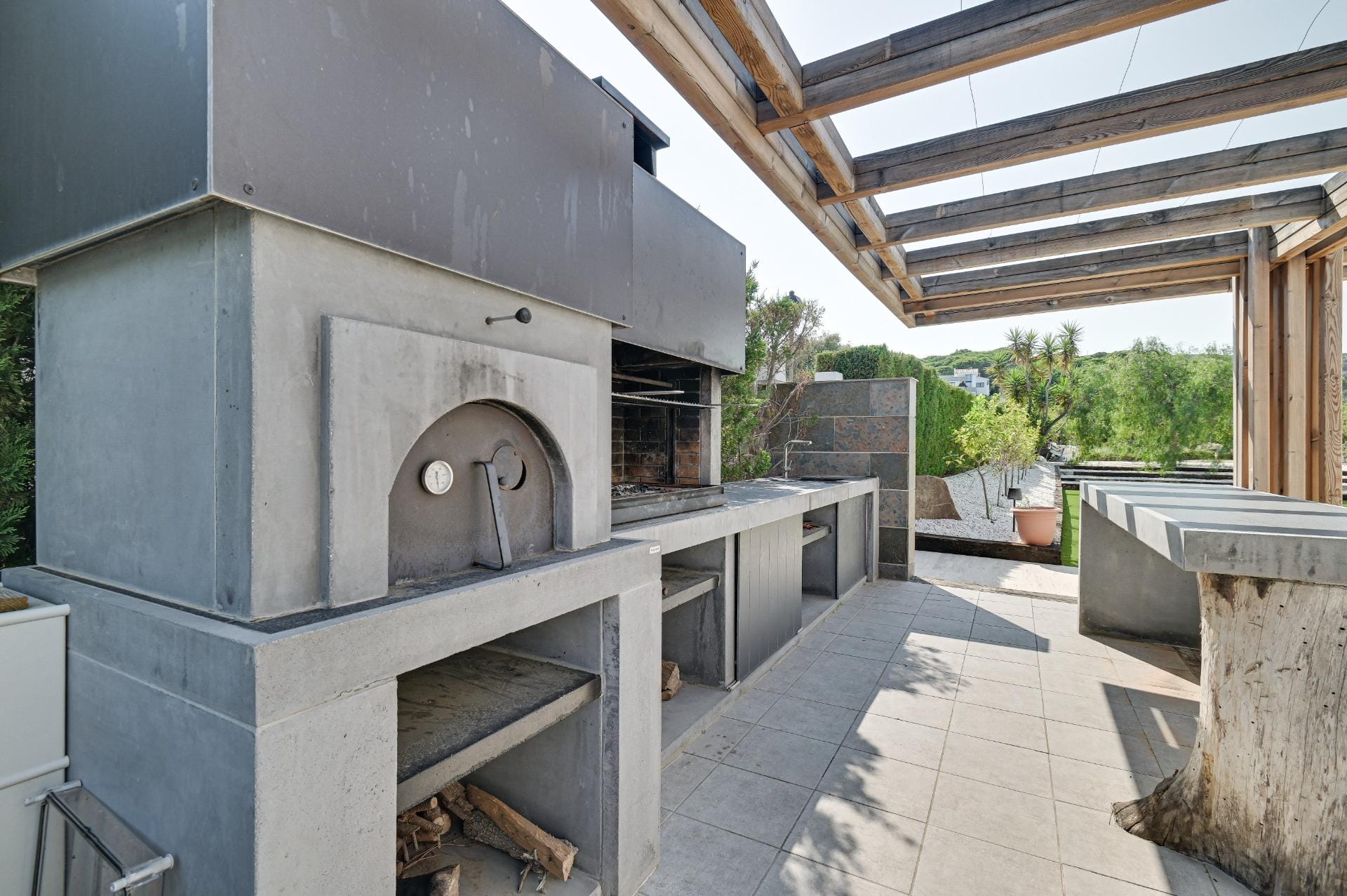 The outdoor areas impress with a swimming pool framed by elegant travertine marble details, well-kept green areas, a large barbecue area and an extensive plantation of fruit trees.