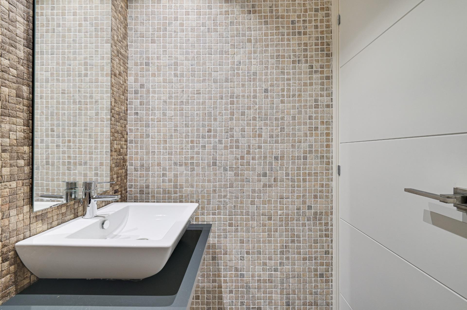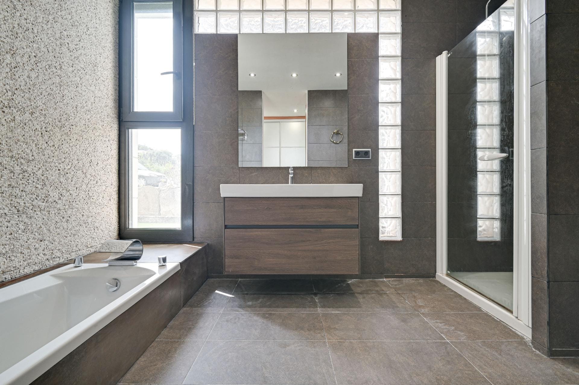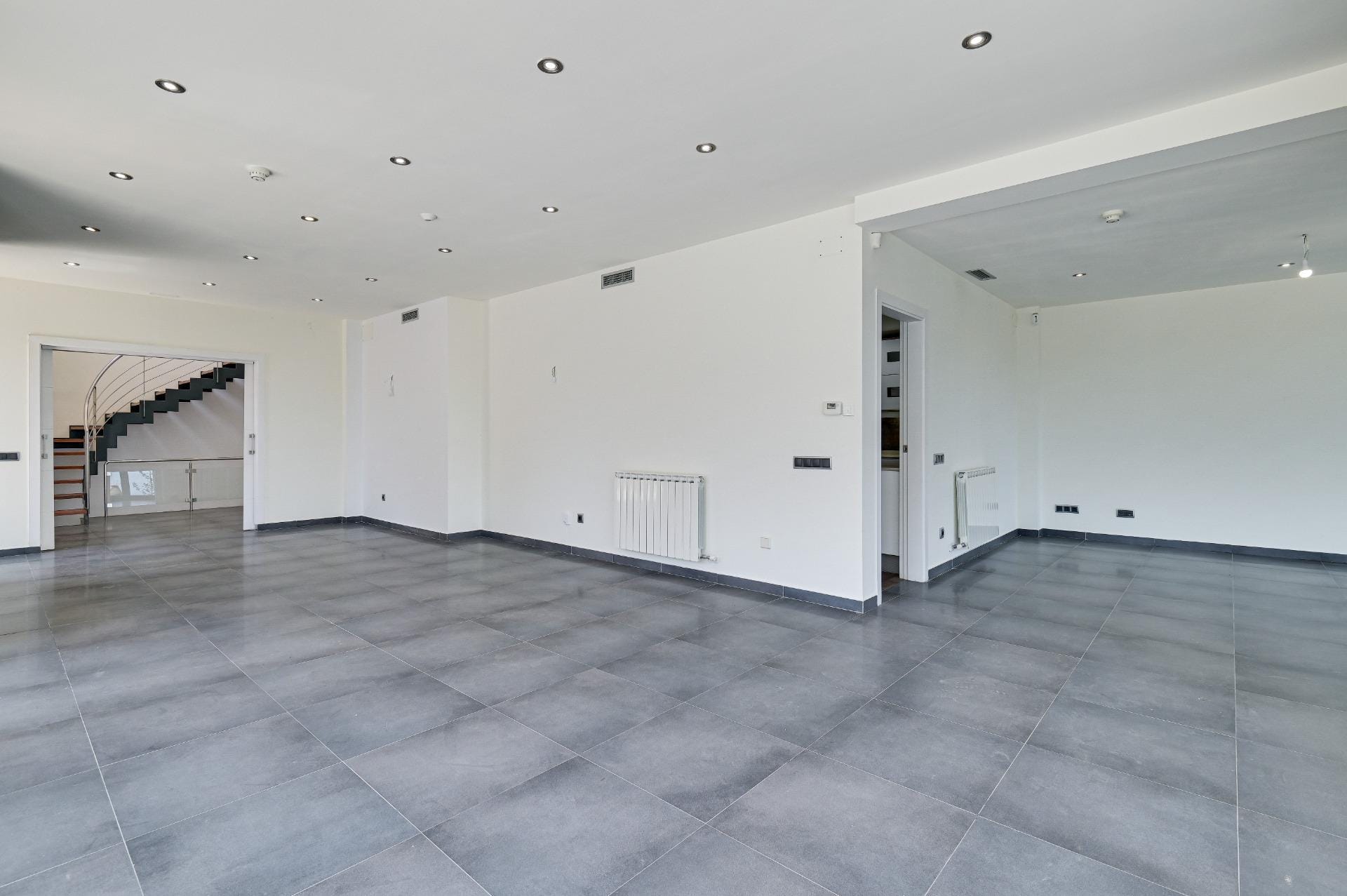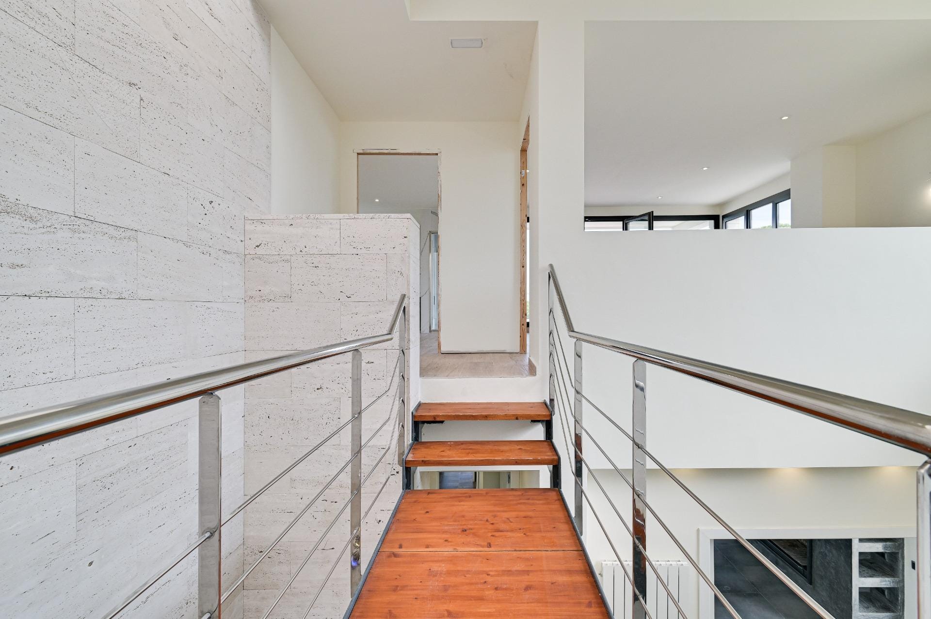 We are greeted by a spacious and bright lobby with a modern staircase made of travertine marble.