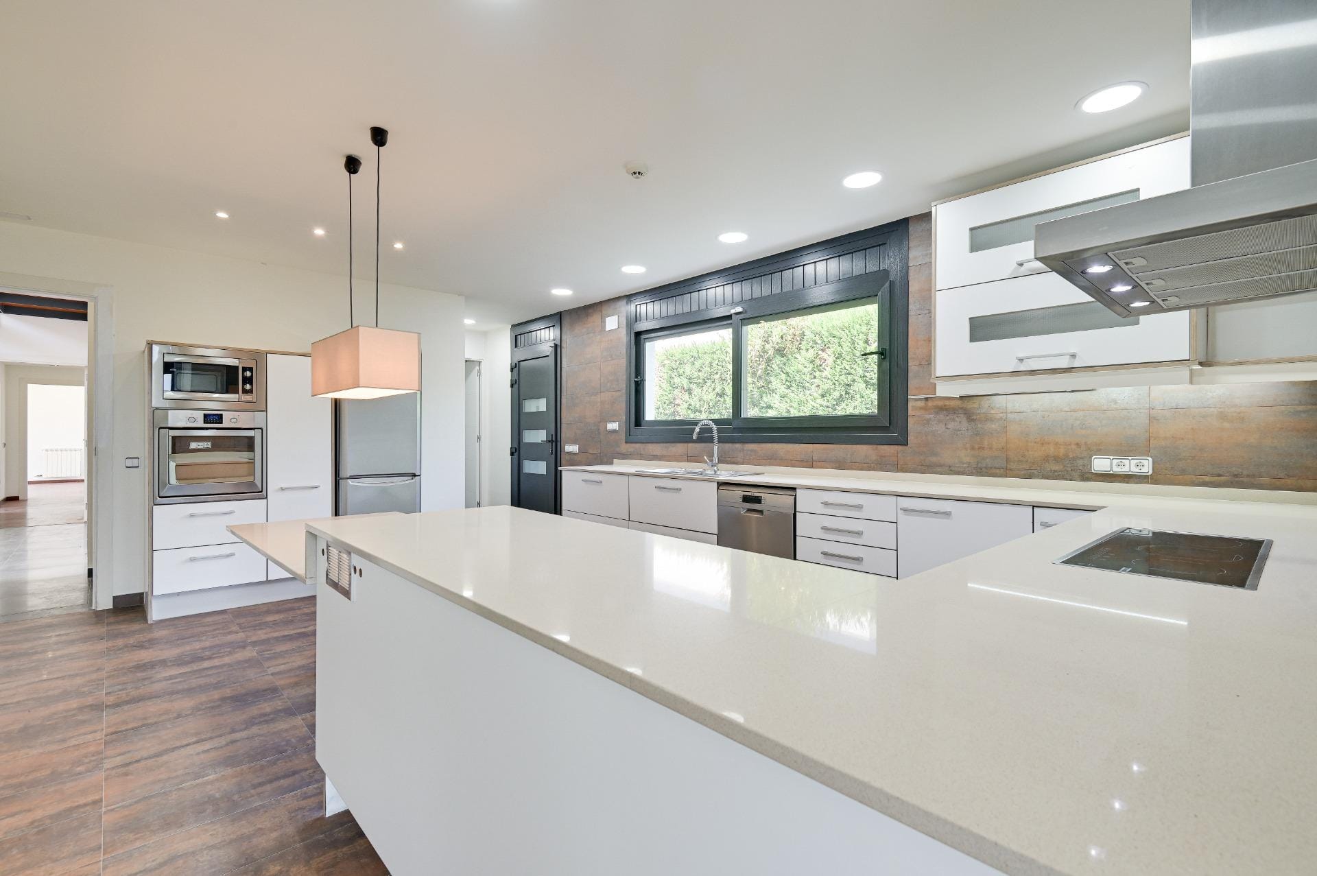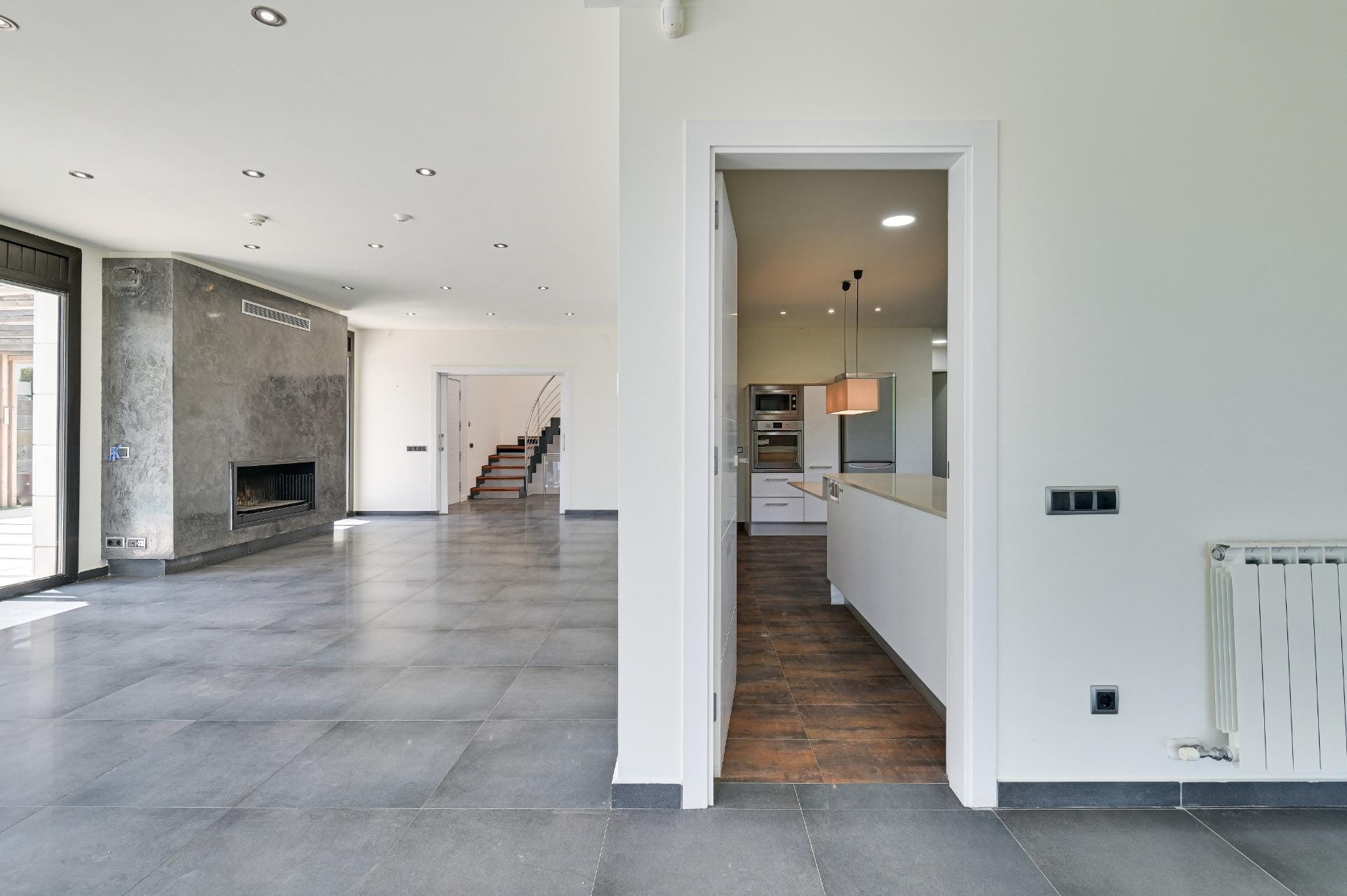 To the right we access the day area. The modern 21m2 kitchen has double access with connection to the outside area and a practical laundry area. The two-room living room (65 m²) is ideal for relaxing moments and for entertaining your guests, in front of the fireplace and large windows that provide plenty of natural light. The day area has a toilet.